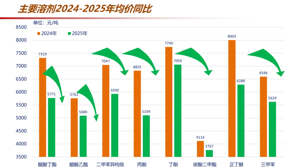 A. Over the past 10 years, the prices of most solvents used in coatings have plummeted by more than 40%: Xylene (a major solvent for industrial coatings): Market price once reached 11,000 yuan/ton, now it is 5650 yuan/ton. A sharp drop of 48.64%! Average price in 2025 compared to the previous year: -15.85%. Butyl acetate (a major solvent for wood coatings): Market price once reached 12,000 yuan/ton, now it is 6610 yuan/ton. A sharp drop of 49.2%! Average price in 2025 compared to the previous year: -21.15%. Ethyl acetate (a major solvent for industrial coatings): Market price once reached 10,000 yuan/ton, now it is 5160 yuan/ton. A sharp drop of 48.4%! Average price in 2025 compared to the previous year: -11.68%. Ethylene glycol monobutyl ether (a major solvent for industrial coatings): Market price once reached 26,000 yuan/ton, now it is 7200 yuan/ton. A sharp drop of 72.31%! Dimethyl carbonate (a major solvent for wood coatings): Market price once reached 12,000 yuan/ton, now it is 3800 yuan/ton. A sharp drop of 68.33%! Average price in 2025 compared to the previous year: -8.5%. MIBK (a major solvent for industrial coatings): Market price once reached 26,000 yuan/ton, now it is 7200 yuan/ton. A sharp drop of 72.31%! Average price in 2025 compared to the previous year: -35.42%. Trimethylbenzene (a major solvent for industrial coatings): Market price once reached 10,000 yuan/ton, now it is 5800 yuan/ton. A sharp drop of 42%! Average price in 2025 compared to the previous year: -16.14%. Tetramethylbenzene (a major solvent for industrial coatings): Market price once reached 10,000 yuan/ton, now it is 5400 yuan/ton. A sharp drop of 46%! Average price in 2025 compared to the previous year: -16.63%. N-butanol (a major solvent in industrial coatings): The market price once reached 20,000 yuan/ton, but has now fallen to 6,600 yuan/ton. A sharp drop of 34%! Average price in 2025 compared to the previous year: -21.43%.